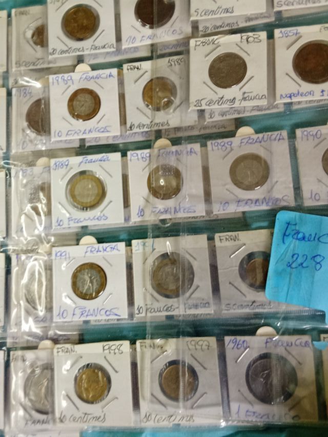 Detalles del productoColección de 228 monedas de francos franceses, con diversas fechas y denominaciones.encartonadas y en fichas.