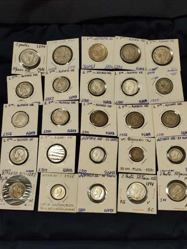 Detalles del productoColección de 25 monedas de plata de la dinastía Borbón.