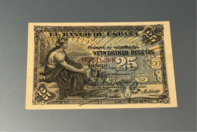 Detalles del productoBillete de 25 pesetas del Banco de España, emitido en Madrid en 1906.