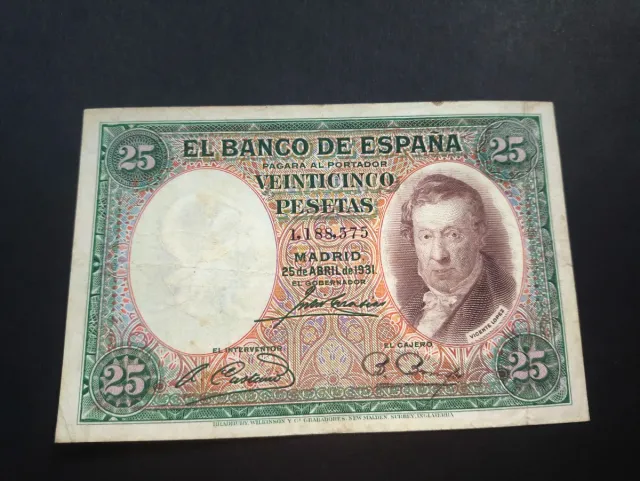 Detalles del productoBillete de 25 pesetas del Banco de España con fecha de 25 de abril de 1931.