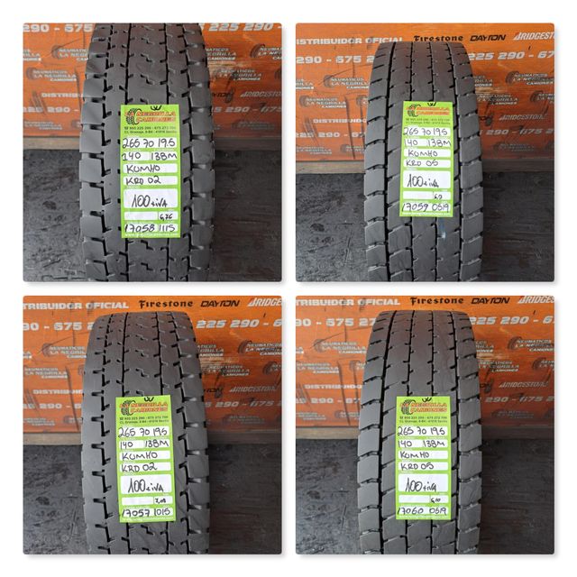 Detalles del productoPrecio final de 4 neumáticos 484€ .marca: KUMHO modelo: KRD 02 Y KRD 05 de segundo uso. precio con iva y porte gratis toda península .el juego de 4 , se venden solamente junto. Más info. whatsapp 675272706. tenemos neumaticos camion,agricolas,industriales, tractor,maquinaria; TODOS ELLOS GARANTIZADOS!!, estamos en calle gramaje no. 30, sevilla 41016