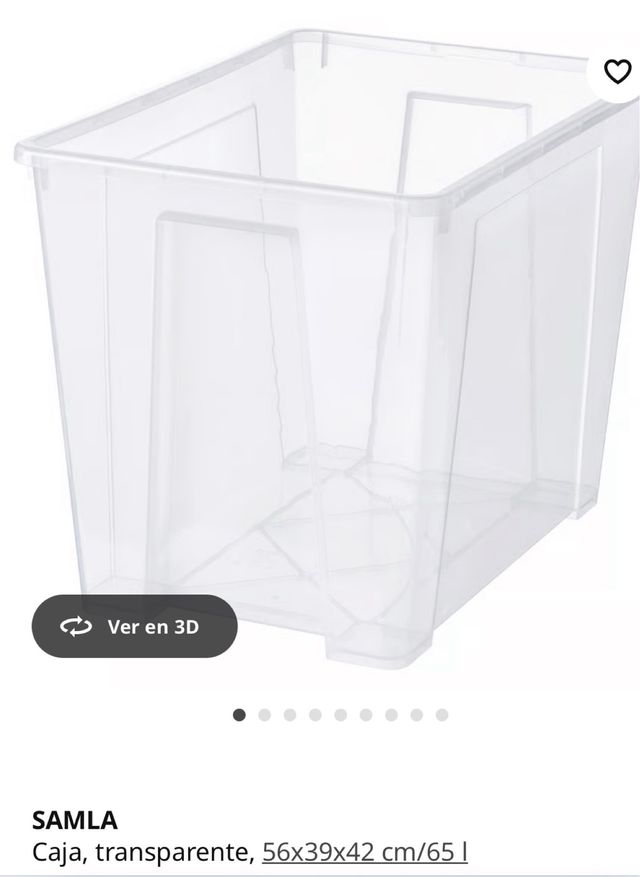 Detalles del productoCaja de almacenamiento Samla de IKEA con una capacidad de 65 litros. Es transparente y cuenta con asas para facilitar su transporte.