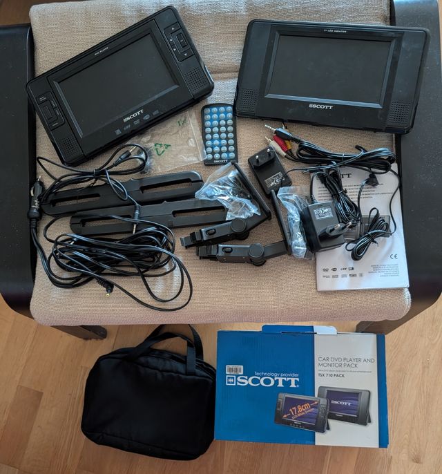 Detalles del productoDos reproductores DVD para coche Scott de 7 pulgadas, en buen estado. Ideales para entretener a los pasajeros traseros.