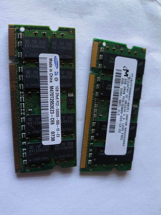 Conjunto de dos módulos de memoria RAM DDR2. - Un módulo de 1GB. - Un módulo de 2GB. - Frecuencia de 667MHz. 6 euros los 2
