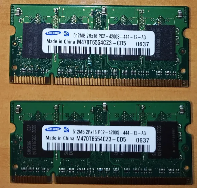 Se venden dos módulos de memoria RAM. - Capacidad: 512MB cada uno. - Tipo: PC2-4200S. - DDR2 533 MHz - Fabricante: Samsung.