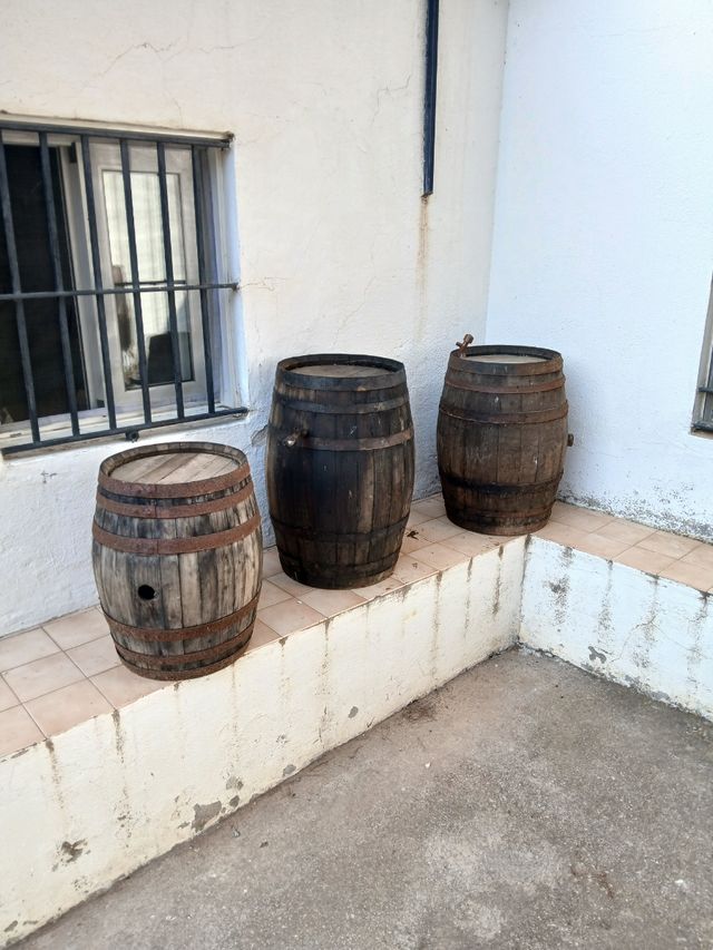 Detalles del productoTres barricas de madera antiguas, ideales para restaurar, decoración. Son de diferentes tamaños y muestran señales de uso que les dan un aspecto rústico y encantador.