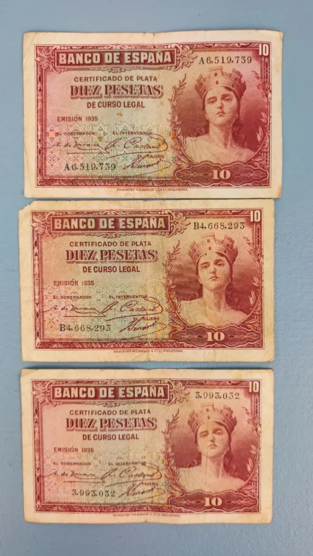 Detalles del productoLote de tres billetes de 10 pesetas del Banco de España, emitidos en 1935.