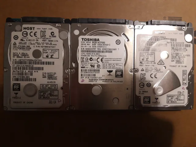 Detalles del productoLote de tres discos duros, dos de la marca HGST y uno de la marca Toshiba. SATA de 500Gb y 2,5 pulgadas para ordenador portátil. Verificados conCrystalDiskInfo y formateados.