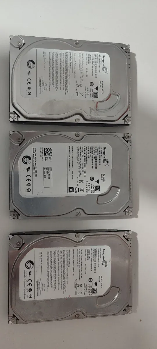Conjunto de tres discos duros Seagate de 500 GB cada uno. - Capacidad: 500 GB - Modelo: Barracuda - Interfaz: SATA - Velocidad: 7200 RPM