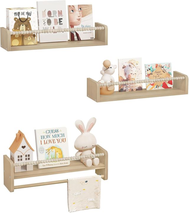 Detalles del productoPreciosos estantes de madera para habitación infantil. Ideales para organizar libros y juguetes. Son de color beige claro y tienen un diseño sencillo y elegante.