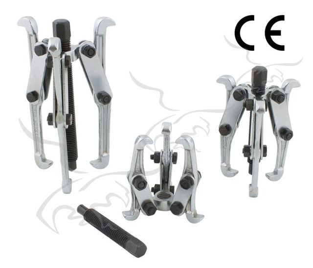 Juego de extractores de 3 garras 3 piezas. Set de 3 extractores que le permitirán extraer con facilidad poleas, engranajes, correas, rodamientos, cojinetes y piezas similares. Las 3 garras aseguran una distribución uniforme de la fuerza y un agarre seguro. La base del eje extractor se presenta perfilada y rematada en pico, esto asegura una fijación óptima al hacer presión. Medidas: 75, 100 y 150 mm. Cabezal de 14-15 mm para carraca. Eje de presión con punta perfilada. Indicados para espacios reducidos. Reversibles; válidos para trabajos en interior/exterior. Fabricados según normativa CE. Se hacen envíos a todo España