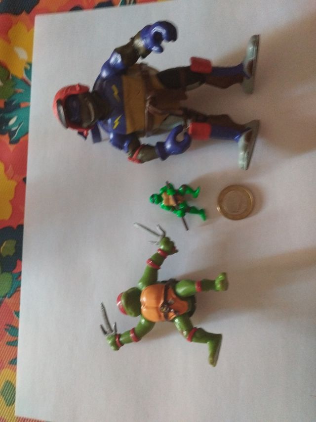 Detalles del productoTres figuras de Tortugas Ninja. Una figura es más grande que las otras dos. Las figuras están en buen estado. - Incluye 3 figuras de acción. - Figuras de plástico. - Ideales para coleccionistas.