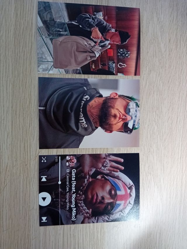 Conjunto de tres fotografías. - Una de ellas muestra un bolso. - Otra imagen presenta a una persona con una sudadera. - La tercera foto es una captura de una canción.