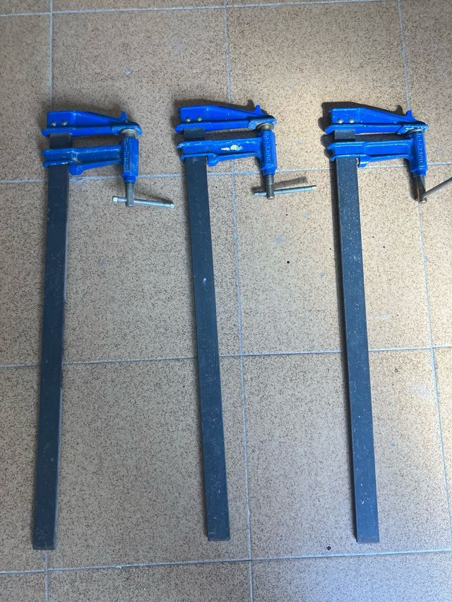 Set de tres gatos de carpintería de color azul. - Cuerpo de metal resistente. - Mecanismo de apriete manual. - 60 cm.