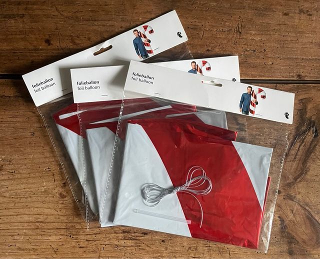 Detalles del productoLote de 3 globos grandes (miden 1,2metros) con forma de bastón de caramelo. Están nuevos (paquetes precintados) de la tienda FLYING TIGER de hace varias temporadas. Son de la primera versión que se hizo, de “aspecto metálico de rayas rojas y blancas”.