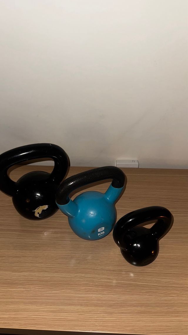 Conjunto de tres kettlebells de diferentes pesos y colores. - Kettlebell negra grande.12 k - Kettlebell negra pequeña. 4