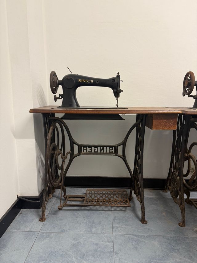 Detalles del productoMáquina de coser Singer de estilo antiguo, con su base de hierro fundido y pedal.