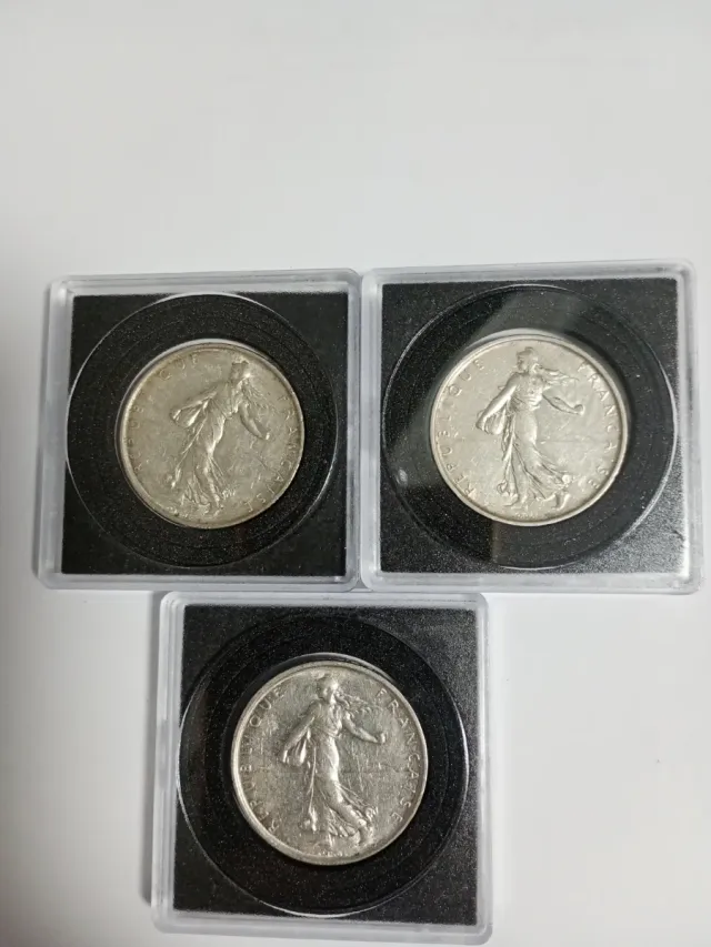 Detalles del productoConjunto de tres monedas de 5 francos franceses.