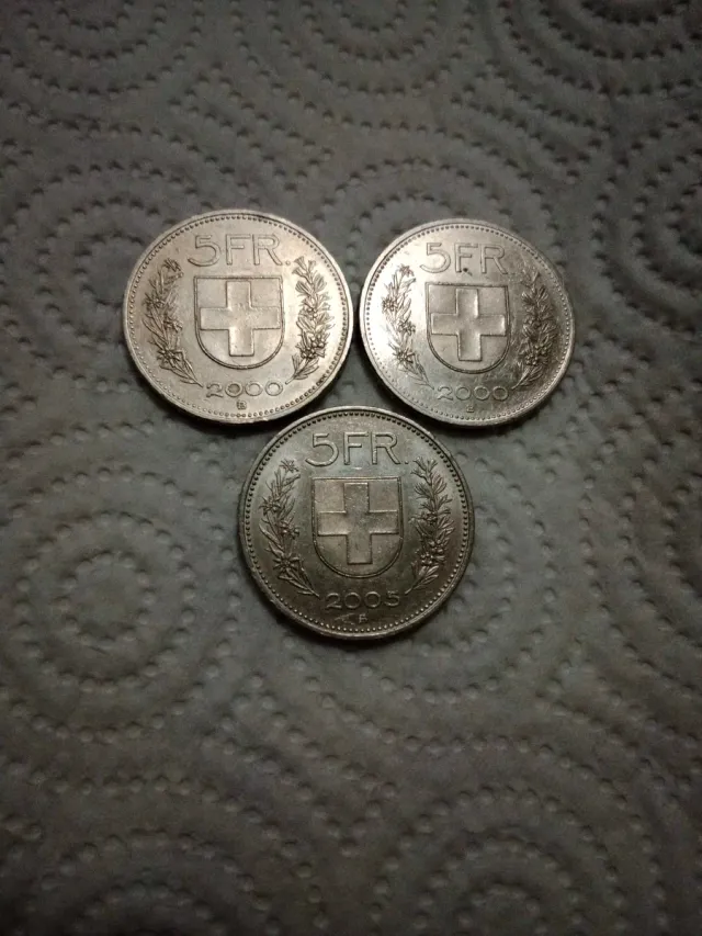 Detalles del productoConjunto de tres monedas de 5 francos suizos.en buen estado,SE VENDEN LAS 3 POR 12 EUROS O SUELTAS 5 EUROS CADA MONEDA