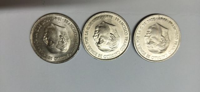 Detalles del productoTres monedas de 5 pesetas franquistas de 1949. Están muy bien conservadas y son muy bonitas. se ven mejor en la mano que en fotos