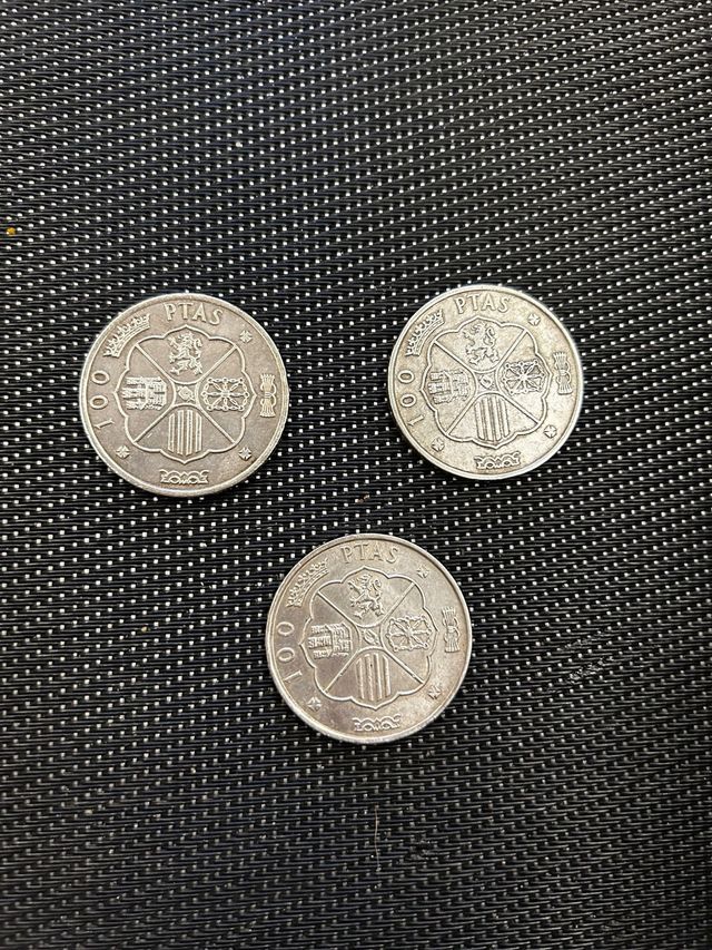 Conjunto de tres monedas antiguas de 100 PTAS. Se encuentran en buen estado de conservación. - Diseño con escudo. - Inscripción 100 PTAS.