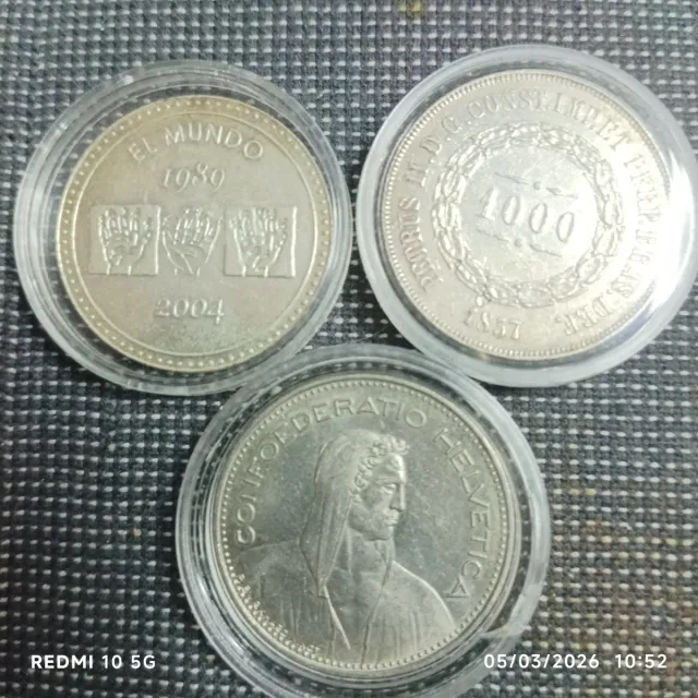 Conjunto de tres monedas de colección. - Moneda El Mundo con año 1989 y 2004. - Moneda con 1000 y año 1857. - Moneda Confederatio Helvetica.