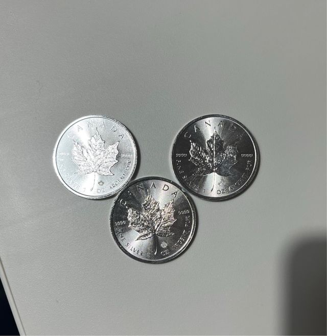 Conjunto de tres monedas de plata de Canadá. - Cada moneda pesa 1 onza. - Pureza de plata de 9999. - Diseño de hoja de arce. - Año: 2015.