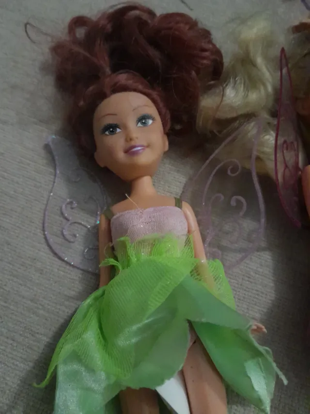Conjunto de tres muñecas hada con alas. - Muñeca con pelo castaño y vestido verde. - Muñeca con pelo rubio. - Alas transparentes y rosas.