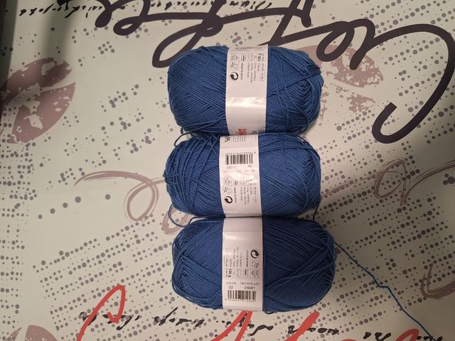 Detalles del productoTres ovillos de lana acrílica de color azul. Son perfectos para tejer bufandas, gorros o cualquier otro proyecto de punto.