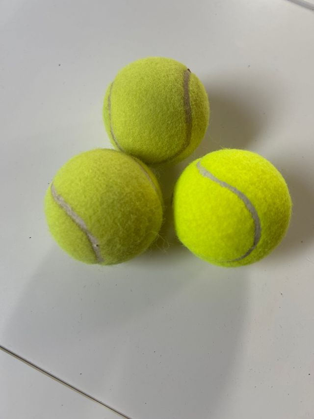 Tres pelotas de tenis o pádel usadas, en buen estado. - Ideales para practicar. - Color amarillo. - Ligeras marcas de uso.