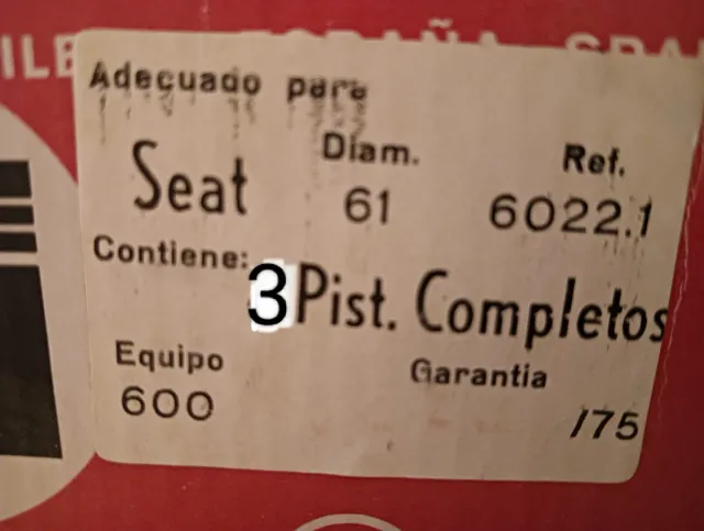 Kit de 3 pistones completos para Seat 600. - Marca: Tarabusi - Diámetro: 61 mm - Segmentos, bulones y clips incluidos