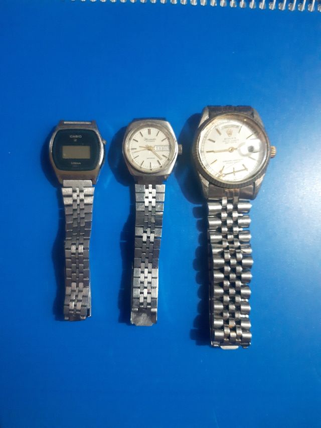 Detalles del productoTres relojes originales con correa original un Casio de mujer a pila un Termidor de mujer automático un Rolex de hombre automático los tres no funcionan son relojes antiguos el precio es por los tres juntos