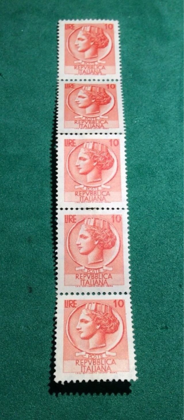 Conjunto de cinco sellos italianos Siracusana con valor de 10 Lire. - Diseño Siracusana. - Valor facial de 10 Lire.