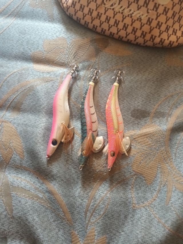 Tres señuelos de calamar en perfecto estado. Son ideales para la pesca. - Tres unidades incluidas. - Colores llamativos y vistosos. - Diseño realista.