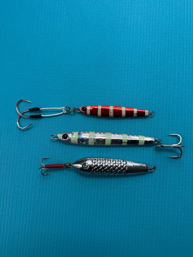 Conjunto de tres señuelos para pesca. - Dos señuelos de 100 gramos y 14 cm. - Un señuelo de 50 gramos y 11 cm.