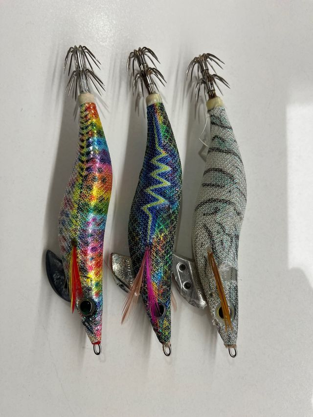 Lote de tres señuelos para la pesca de calamar (eging). Tamaño 3.5 El K tiene un bocado