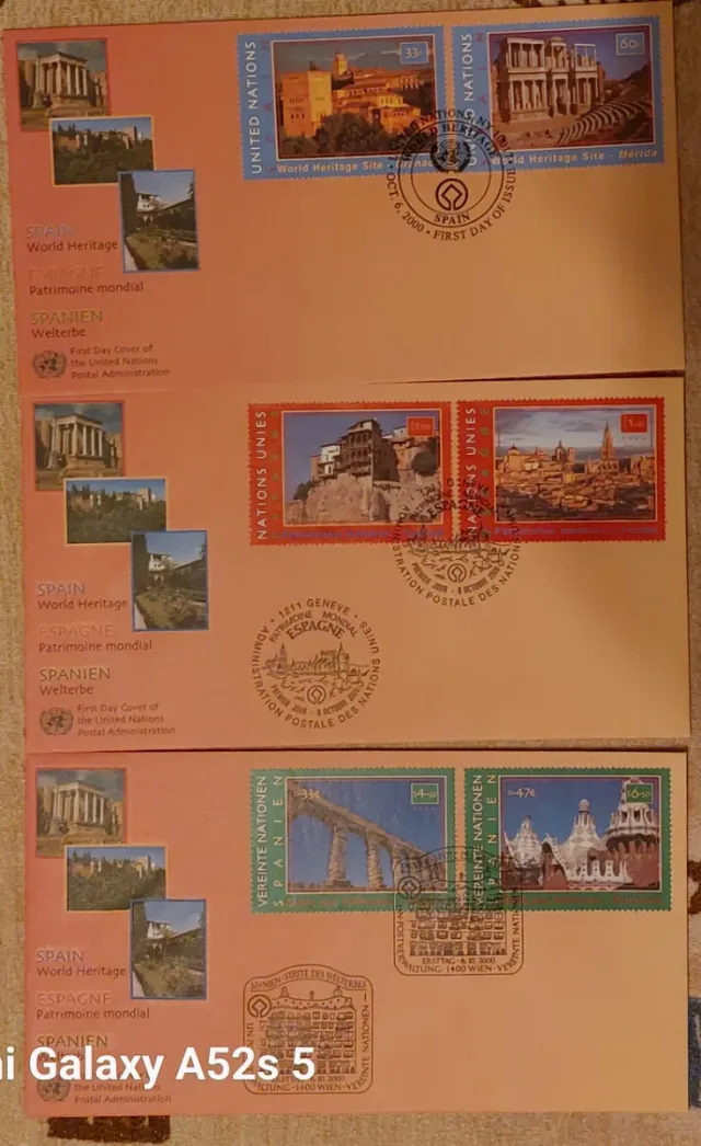 - Cada sobre presenta sellos y matasellos relacionados con sitios del patrimonio mundial.