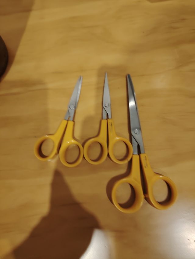 Detalles del productoTres tijeras pequeñas de distintos tamaños. Son de color amarillo y parecen estar en buen estado.