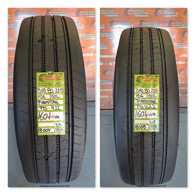 Detalles del productoPrecio final de 2 neumáticos 387€ .marca: FIRESTONE modelo: FS 422 de segundo uso. precio con iva y porte gratis toda península .el juego de 2 , se venden solamente junto. Más info. whatsapp 675272706. tenemos neumaticos camion,agricolas,industriales, tractor,maquinaria; TODOS ELLOS GARANTIZADOS!!, estamos en calle gramaje no. 30, sevilla 41016