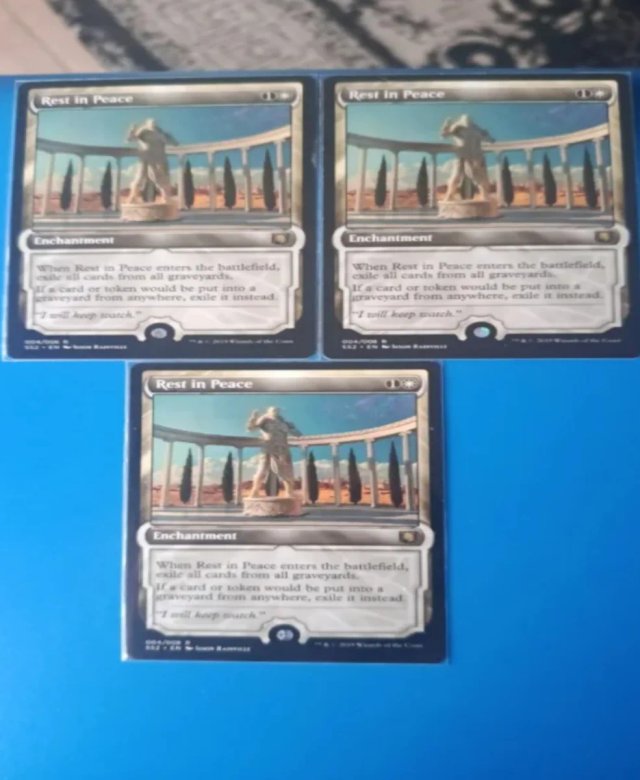 Se venden 3 cartas de Rest in Peace del juego Magic: The Gathering. - Tipo de carta: Encantamiento. - Idioma: Inglés. - Edición: 2019.