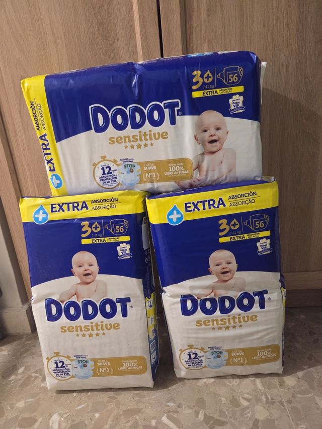 Pack de Dodot Sensitive talla 3+. - 56 unidades en cada paquete. - Absorción extra. - Protección de la piel. - Barrera stop fugas. - Noche hasta 100% libre de fugas.