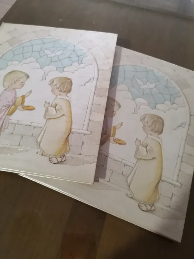 Detalles del productoLote de cuatro álbumes vintage para fotografías de comunion . Cada álbum presenta un diseño tierno con ilustraciones de niños y palomas, enmarcados en arcos. Para 8 fotos 15x20cm