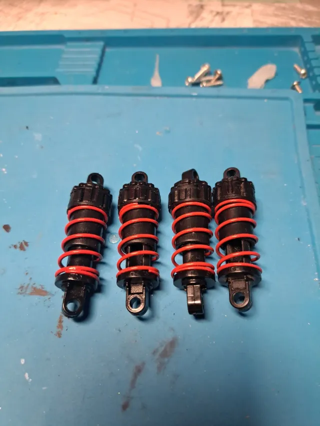 Detalles del productoSet de cuatro amortiguadores de plástico con resortes rojos.