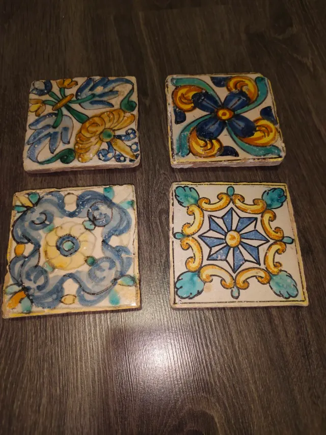 Detalles del productoConjunto de cuatro azulejos antiguos con diseños florales y geométricos.
