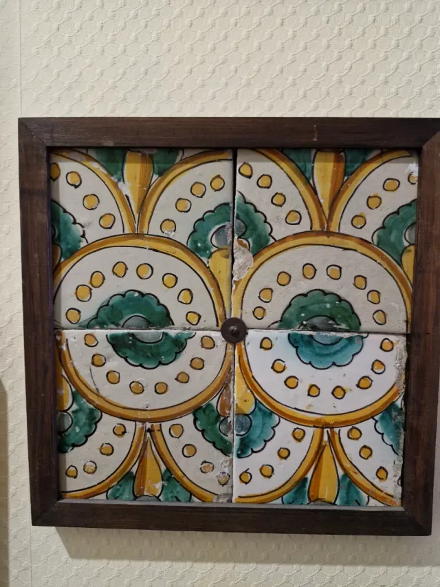 Conjunto de cuatro azulejos antiguos con un diseño decorativo. - Motivos florales y geométricos. - Colores amarillo, verde y blanco. - Marco de madera incluido.
