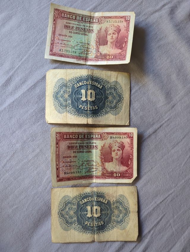 Lote de cuatro billetes de 10 pesetas del Banco de España, emitidos en 1935. - Serie y numeración visibles