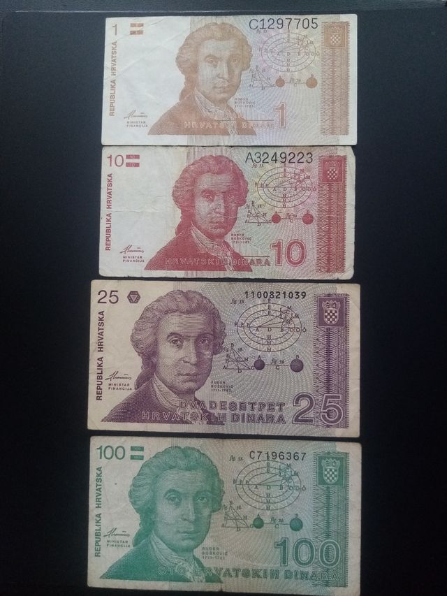 4 Billetes Croatas antiguos (1, 10, 25, 100)