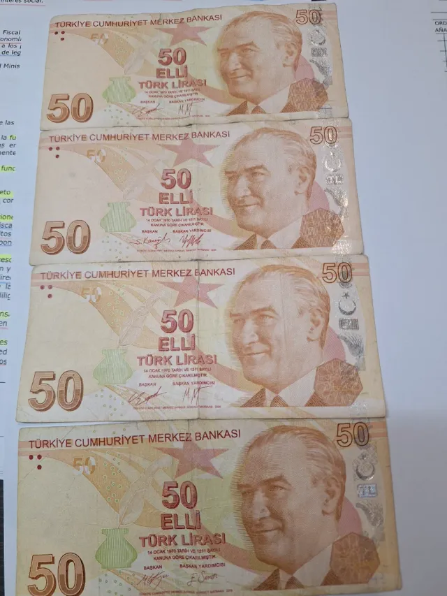 Lote de 4 billetes de 50 liras turcas de Turquía. Cada billete muestra el retrato de Mustafa Kemal Atatürk. - Serie de billetes de Turquía. Total de 200 liras turcas.