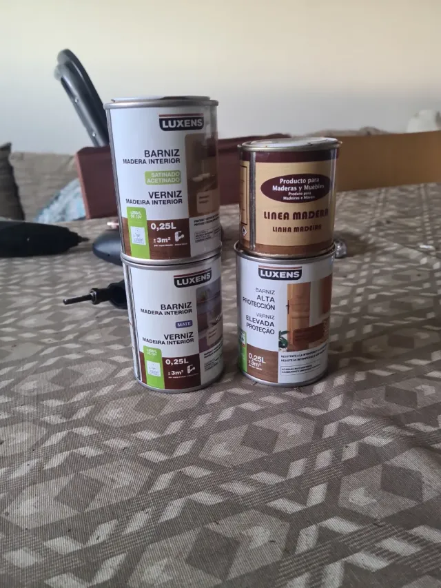 Detalles del productoLote de 4 botes de barniz Luxens para madera de interior.