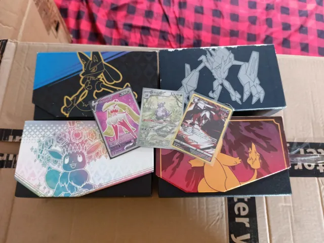 Lote de coleccionismo de Pokémon. - Incluye 4 cajas de diferentes diseños. - Se añaden 3 cartas de Pokémon.